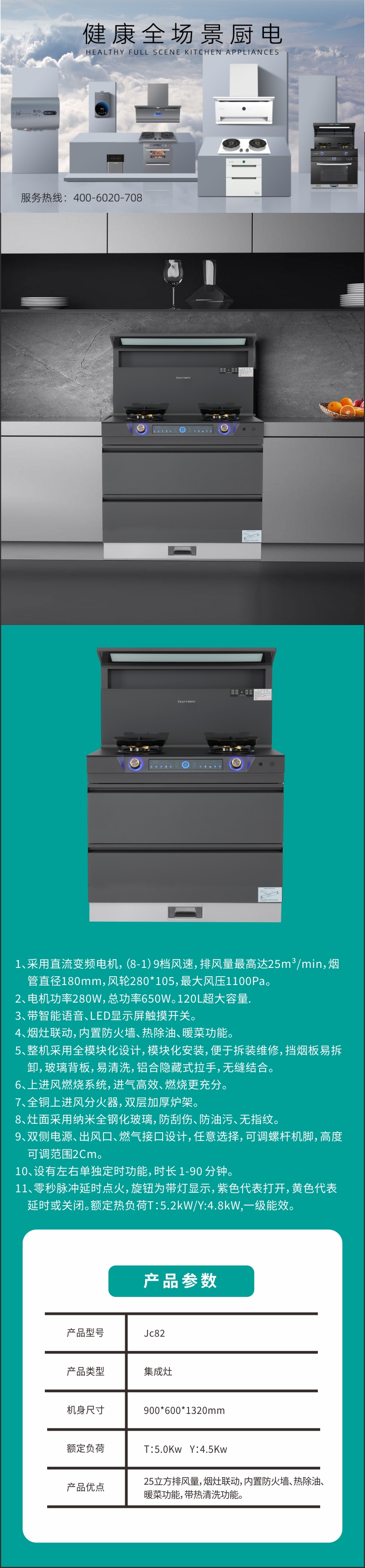 带智能语音、LED显示屏触摸开关。烟灶联动,内置防火墙、热除油、暖菜功能