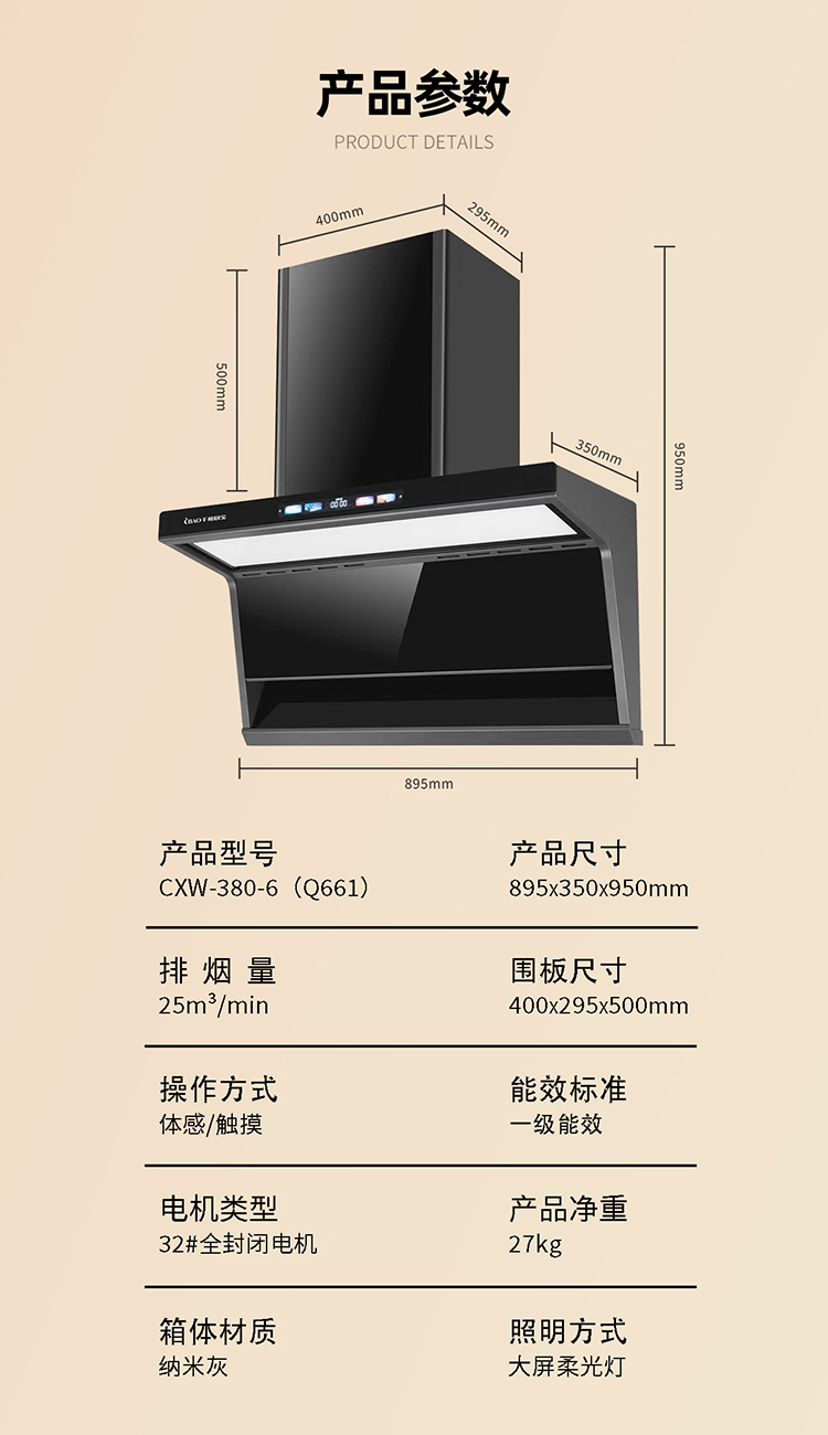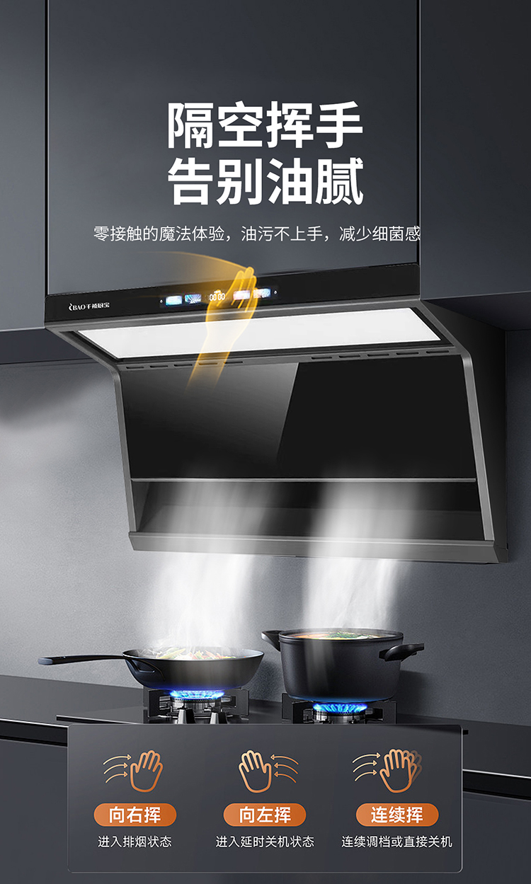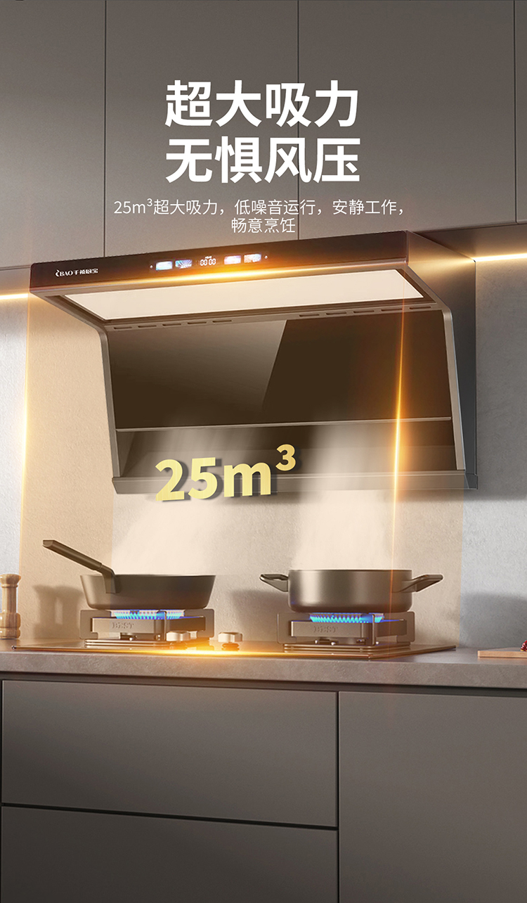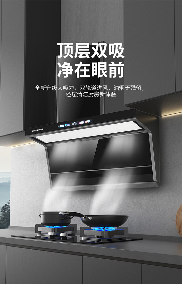 采用图腾触屏体感开关,32 全封闭电机,25立方大吸力,带热清洗功能,顶侧双吸立体拢烟,国标一级能效