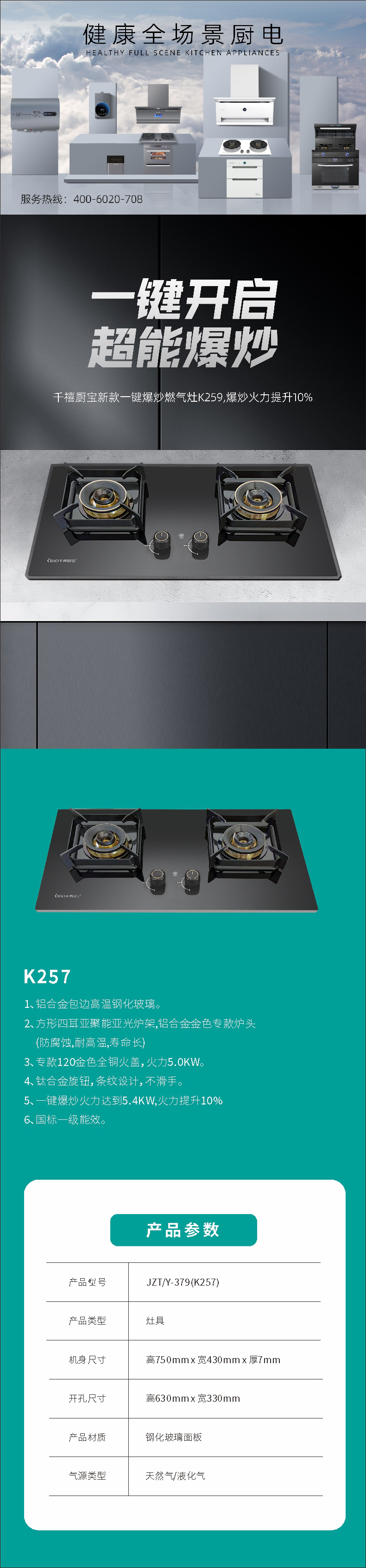 铝合金包边高温钢化玻璃,方形四耳聚能哑光炉架,防腐蚀,耐高温,一键爆炒按钮,爆炒火力可达5 4KW,专款120大金色全铜火盖,火力达5 0KW,符合国家标准,一级能效