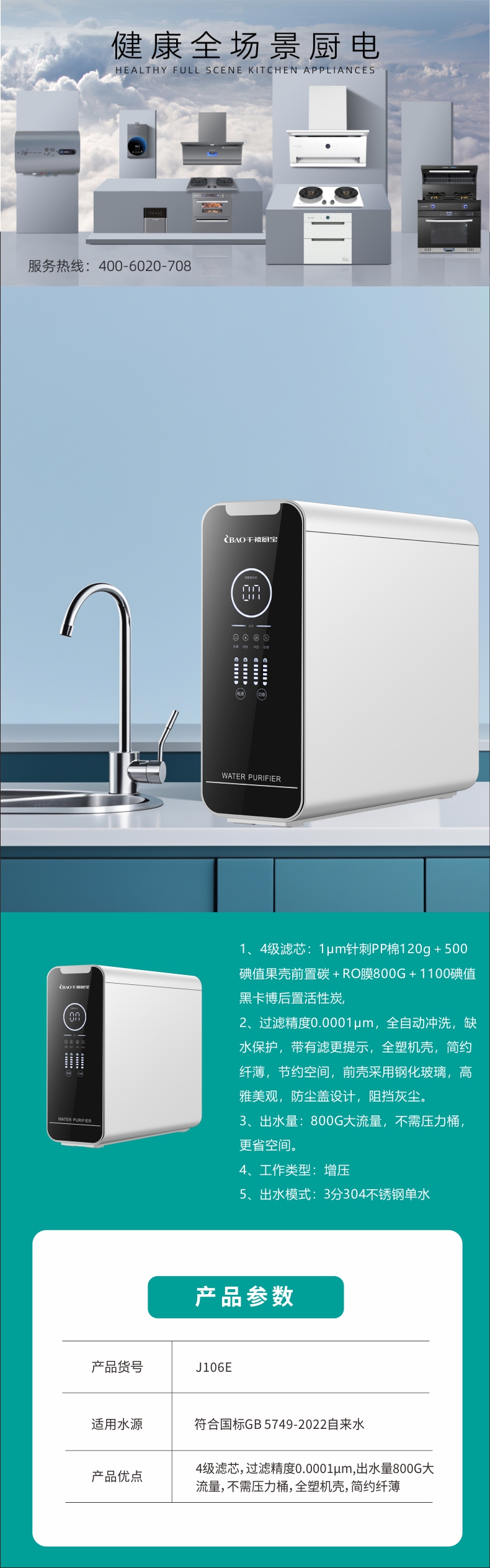 全自动冲洗,缺水保护,带有滤更提示,全塑机壳,简约纤薄,节约空间