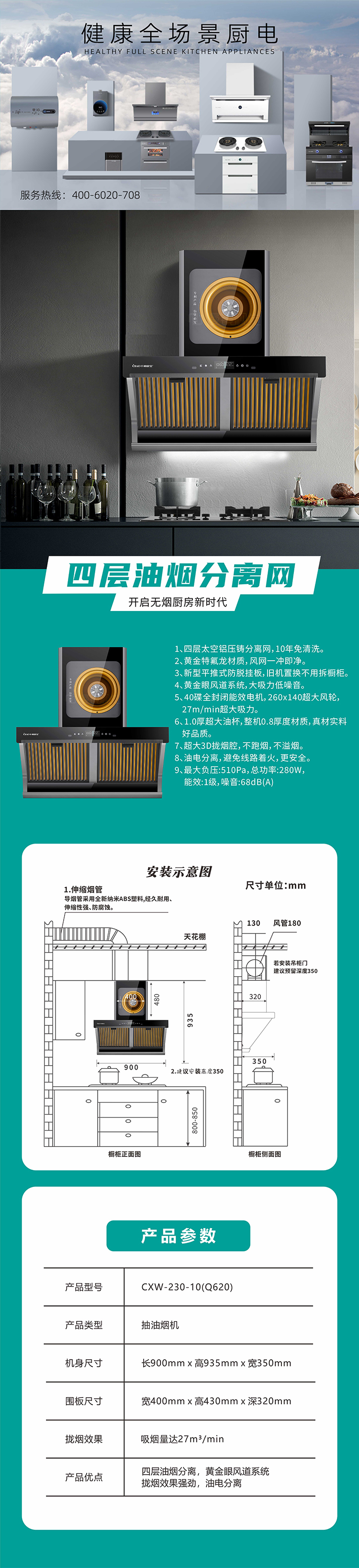 四层太空铝压铸分离网,10年免清洗,行业专利独有,黄金特氟龙材质,专利黄金眼风道系统,透明3D拢烟腔,27m3 min大吸力,一级能效,油电分离,避免线路着火,更安全