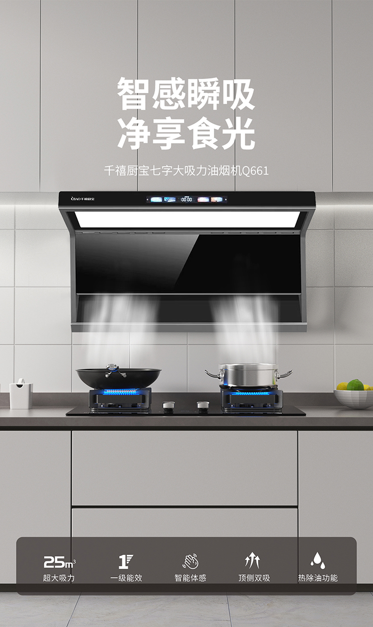 采用图腾触屏体感开关,32 全封闭电机,25立方大吸力,带热清洗功能,顶侧双吸立体拢烟,国标一级能效