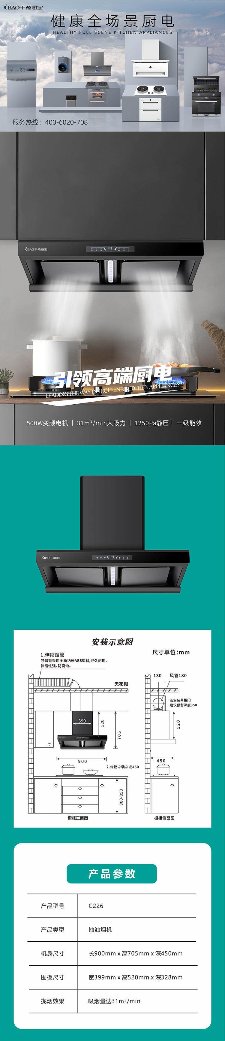 500W变频电机 31m³ min大吸力 1250Pa静压 一级能效