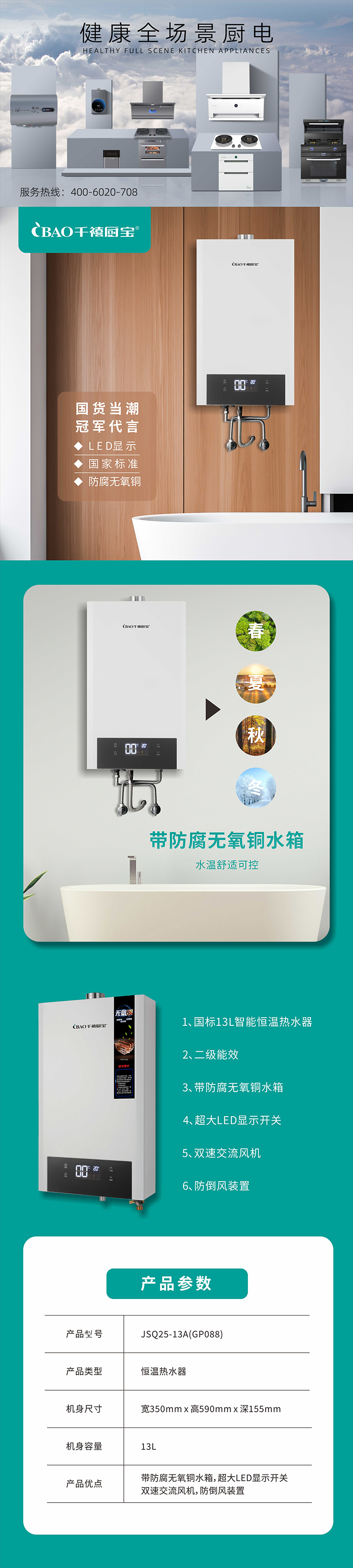 双速交流风机,抗风压,超大LED白屏显示,操作简单,防倒风装置,防腐无氧铜水箱,防腐蚀,国标13L智能恒温热水器